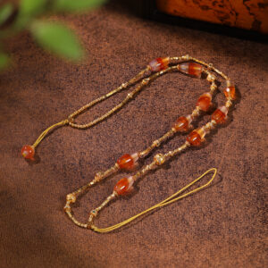 A bracelet featuring “Tiger Tooth” Dzi beads, known for their striped pattern, often combined with other protective stones and strung on a strong cord.