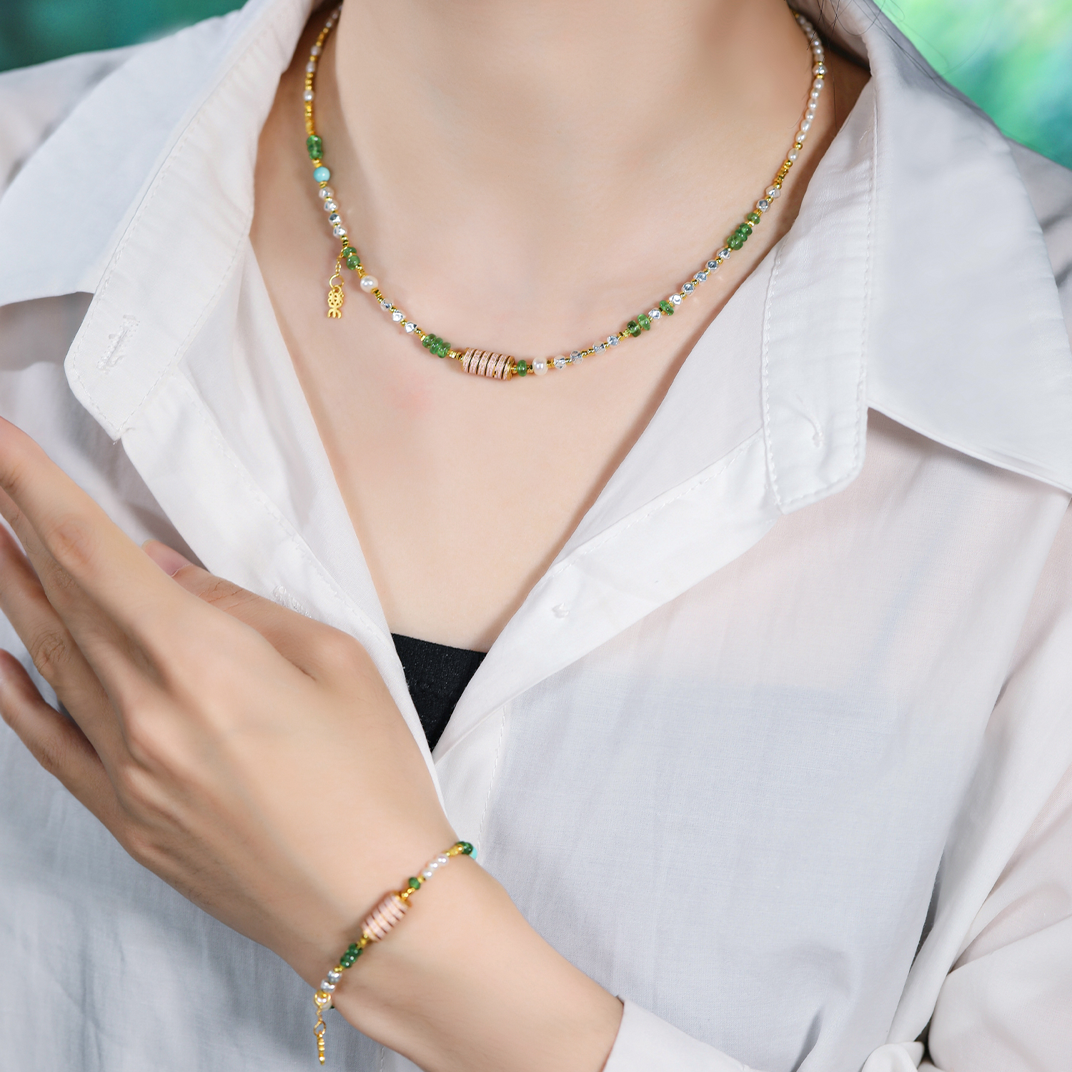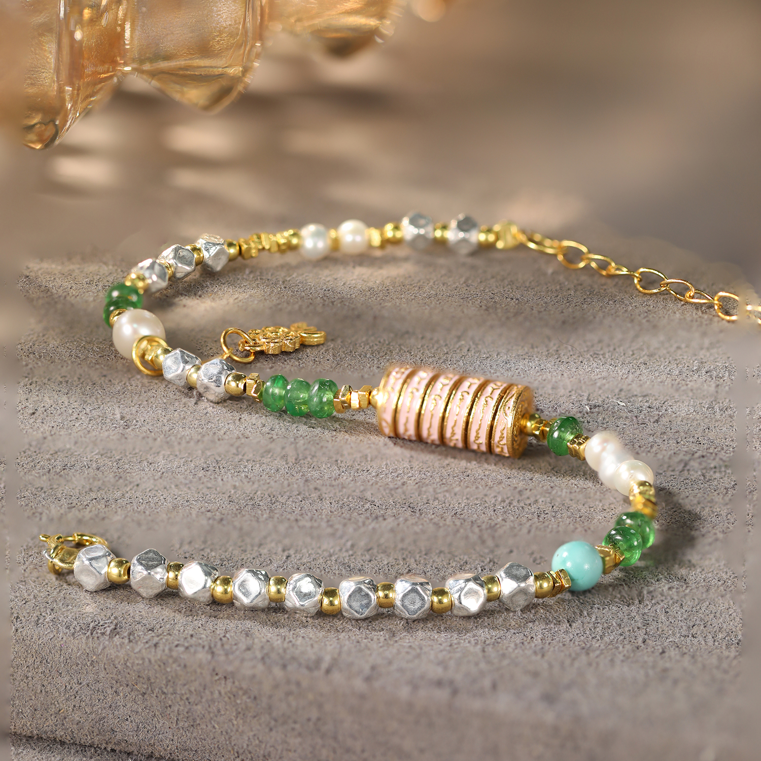 Tsavorite (Wood) encourages growth and new opportunities, while pearls (Water) ensure smooth transitions. A lucky charm for progress and graceful movement through life.
