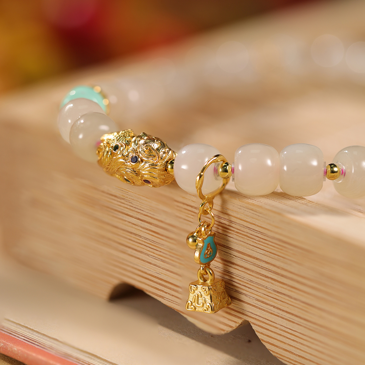 Suspended from the bracelet is a charm shaped like a traditional steelyard weight. On its four sides are engraved the Chinese characters “称心如意” (Chèn Xīn Rú Yì)—a phrase meaning “may all your hopes be fulfilled” or “as your heart desires.”